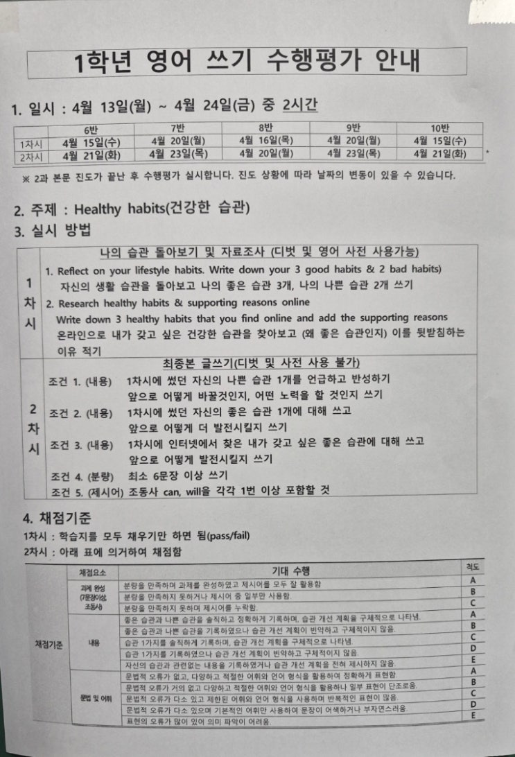 대명중1학년 영어 쓰기 수행평가 안내 (1반 - 5반/6반-10반) 반상황에 따라서 스케줄 변동 가능!! 1차시 나의 습관 돌아보기 및 자료조사 (디벗 및 영어 사전 사용가능) 1. Reflect on your lifestyle habits. Write down your 3 good habits & 2 bad habits 자신의 생활 습관을 돌아보고 나의 좋은 습관 3개, 나의 나쁜 습관 2개 쓰기 2. Research healthy habits & supporting reasons online Write down 3 healthy habits that you find online and add the supporting reasons 온라인으로 내가 갖고 싶은 건강한 습관을 찾아보고 (왜 좋은 습관인지) 이를 뒷받침하는 이유 적기 2차시 최종본 글쓰기 (디벗 및 사전 사용 불가) 조건 1....... <img src="https://blogthumb.pstatic.net/MjAyNjA0MThfMTk4/MDAxNzc2NDgyMDY0Mzcx.karmkTDnec3mPEoRHQmp9rMMCb9LTtQCXA9qP-jsQnMg.k6dVLCNC0slzBjM8SblNH0rCkbRkzIirq9uSuGJoPT8g.JPEG/%B4%EB%B8%ED%C1%DF1_%BC%F6%C7%E0%C6%F2%B0%A1_%286-10%B9%DD%29.jpg?type=s3" />