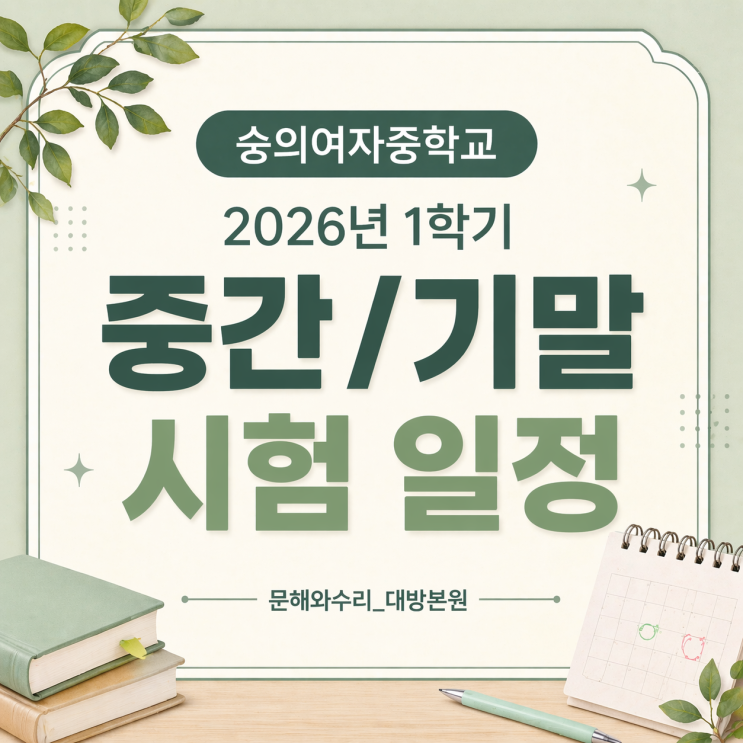 안녕하세요 문해와수리_대방본원입니다. 어느덧 1학기 중간고사가 다가오고 있어 숭의여자중학교 시험 일정을 안내드립니다. 1학기 시험 일정 중간고사 : 4월 29일(수) ~ 4월 30일(목) 기말고사 : 7월 1일(수) ~ 7월 3일(금) 시험이 가까워질수록 지금까지 배운 내용을 한 번 더 정리하는 시간이 중요해집니다. 부담을 느끼기보다는 기본 개념과 틀린 문제를 차분하게 점검하면서 준비해 나가면 좋겠습니다 문해와수리_대방본원에서도 학생들이 끝까지 흐름을 놓치지 않고 안정감 있게 준비할 수 있도록 함께 지도하겠습니다. 문해와수리_대방본원 02-822-1301 010-4885-1302 ※ 문자 문의 시 이름 / 학교 / 학년 / 과목을 남겨주시면 확인 후 연....... <img src="https://blogthumb.pstatic.net/MjAyNjA0MTRfMTE5/MDAxNzc2MTYwNjQ4MTkw.o3owbXB_FDJZ1Iy-0cnSeh-HUiex6-dIx1P5q4QHtm8g.J8ch6jUtEH5pBjn5VAW_jZ4OWMP8mKyhKqWV94cVP0Mg.PNG/%BD%C3%C7%E8_%C0%CF%C1%A4_%BE%C8%B3%BB_%C6%F7%BD%BA%C5%CD.png?type=s3" />