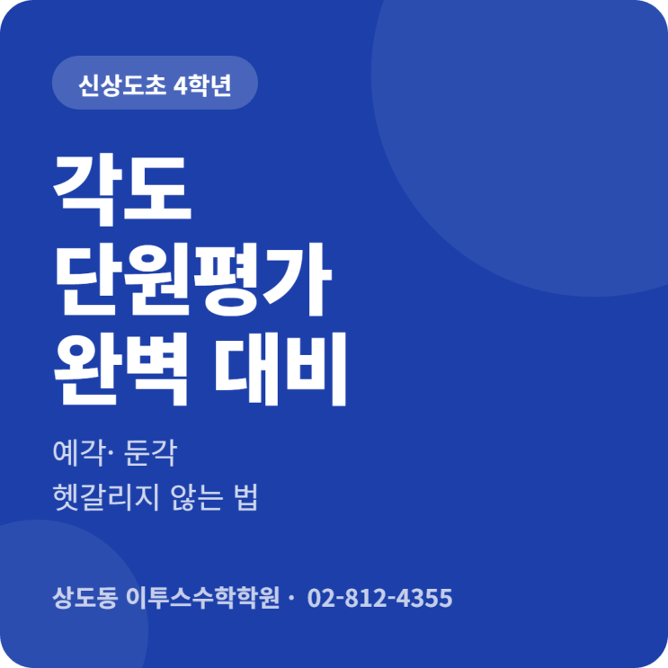 안녕하세요. 상도동수학학원 이투스수학학원입니다. 신상도초 4학년 수학에서 각도 단원은 처음으로 도형의 성질을 본격적으로 배우는 단원입니다. 개념 자체는 어렵지 않지만 실수가 많고, 이후 5학년 도형 단원과 중학교 기하 전체의 기초가 되는 만큼 지금 확실히 잡아두는 것이 중요합니다. 오늘은 각도 단원 평가에서 꼭 알아야 할 핵심 개념부터, 아이들이 실제로 자주 틀리는 유형, 집에서 바로 연습할 수 있는 문제까지 꼼꼼하게 안내드립니다. ■ 핵심 개념 완전 정리 1. 각이란 무엇인가 각은 한 점에서 시작하는 두 반직선이 만들어내는 도형입니다. 두 반직선이 만나는 꼭짓점을 기준으로 벌어진 정도를 숫자로 나타낸 것이 각도입니....... <img src="https://blogthumb.pstatic.net/MjAyNjA0MTVfMjMx/MDAxNzc2MjM5MzczMjQw.qfw_Fnsgd7aKwh4vJCtA7dDF-JhMSgYiiQay-L2-ioYg.9ek5OxNYyPCPvkhqFMeuzfsnl9AbKNhfDOGu_AqIfsYg.PNG/4%C7%D0%B3%E2_%B0%A2%B5%B5_01_%C7%A5%C1%F6_%281%29.png?type=s3" />