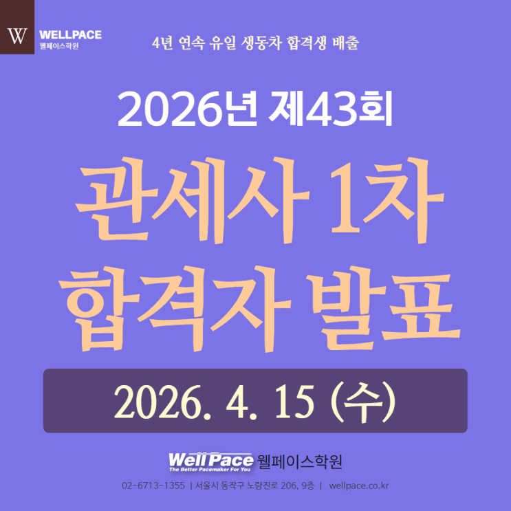 한국산업인력공단이 시행한 2026년도 제43회 관세사 1차 시험 합격자가 4월 15일 오전 9시 큐넷(Q-Net)을 통해 발표됐다. 이번 시험은 지난 3월 14일 서울, 대전, 대구, 부산, 광주 등 전국 5개 지역에서 동시에 실시됐다. 관세사 시험은 수출입 통관 및 무역 관련 전문 인력을 선발하는 국가전문자격시험으로, 매년 많은 수험생들이 응시하고 있다. 합격자 명단은 큐넷 홈페이지를 통해 확인할 수 있다. 이번 2026년 제43허; 관세사 1차 시험은 총 2,122명이 접수하여 1,655명이 실제로 시험에 응시하여 응시율은 77.99%로 집계되었다. 합격인원은 전년보다 248명 증가한 총 466명이며, 합격률은 28.16 %로 전년 15.43%보다 대폭 상승하였습니다....... <img src="https://blogthumb.pstatic.net/MjAyNjA0MTVfMjg1/MDAxNzc2MjEwNjgzNjM0.P5L1OlJl96hF274dUmNaUEro-YPiHeOsFWo10sV2oZ4g.mbGOhrtgIlifJRCgBLFaoanrvK-x8aThTyVm-EMkDL8g.PNG/%BA%ED%B7%CE%B1%D7_25%B3%E2_5%BF%F9.png?type=s3" />