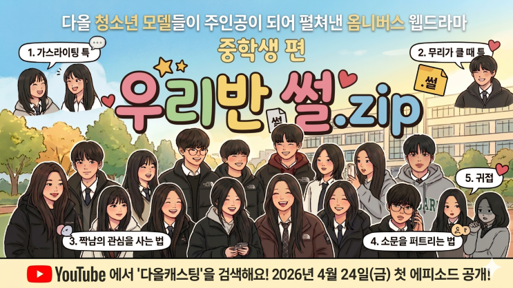 멀홀랜드에서 연기교육을 받고 있는 우리 학생들이 출연한 웹드라마가 곧 공개됩니다 !! 빠밤 !!!! 다올캐스팅 소속 중학생 배우들이 만들어낸 웹드라마 〈우리 반 썰.zip〉 – 중학생 편 이번 작품은 하나의 이야기 흐름이 아닌, 각기 다른 에피소드로 구성된 **옴니버스 형식 (총 5편)**으로 매 회차마다 새로운 배우들과 새로운 이야기가 펼쳐집니다. 학생들의 시선에서 바라본 진짜 학교 이야기. 더 솔직하고, 더 현실적인 고민들을 담았습니다. 에피소드 라인업 EP01. 가스라이팅_특.zip EP02. 무리가 클 때_특.zip EP03. 짝남의 관심을 사는 법.zip EP04. 소문을 퍼트리는 법.zip EP05. 귀접.zip 중학생들의 진짜 학교생활 썰 모....... <img src="https://blogthumb.pstatic.net/MjAyNjA0MDhfMTg4/MDAxNzc1NjE5NDA2MzUy.tnSY5UuEY_7ygBFn9LKtNdDNLpMrFyukmb2YhAaPZQAg.nrwrIlsljecaCv5ujCf_GxWa1_ZtnxWlbtbNXMJ5mXsg.PNG/KakaoTalk_20260408_102034098.png?type=s3" />