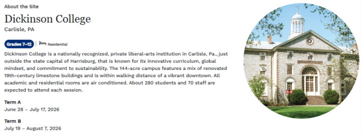 안녕하세요, 조기유학 & 영어캠프 전문 이데아입니다. 오늘은 Johns Hopkins Center for Talented Youth 프로그램 중에서도 학문적 깊이와 몰입도가 높은 것으로 잘 알려진 Dickinson College 캠퍼스를 소개해드리겠습니다. 펜실베이니아주 Carlisle에 위치한 Dickinson College는 미국 내에서도 혁신적인 커리큘럼과 글로벌 마인드, 지속가능성 교육으로 높은 평가를 받는 명문 리버럴 아츠 대학으로, 아름다운 캠퍼스와 쾌적한 기숙 환경을 갖추고 있어 학생들이 학업에 온전히 집중할 수 있는 환경을 제공합니다. 본 프로그램은 Grades 7–12 학생들을 대상으로 진행되는 Residential 캠프로, Term A(2026년 6월 28일–7월 17일)와 Term B....... <img src="https://blogthumb.pstatic.net/MjAyNjA0MTRfMTY1/MDAxNzc2MTM2ODk4NDY4.wRZNbhHDa7vTeZ3wuHppkIutkyeojroiXLjoijJeFfcg.sLfikfVykt1ip3D16mKq5ILCyDVFqepMjge_qoDBcCIg.PNG/image.png?type=s3" />