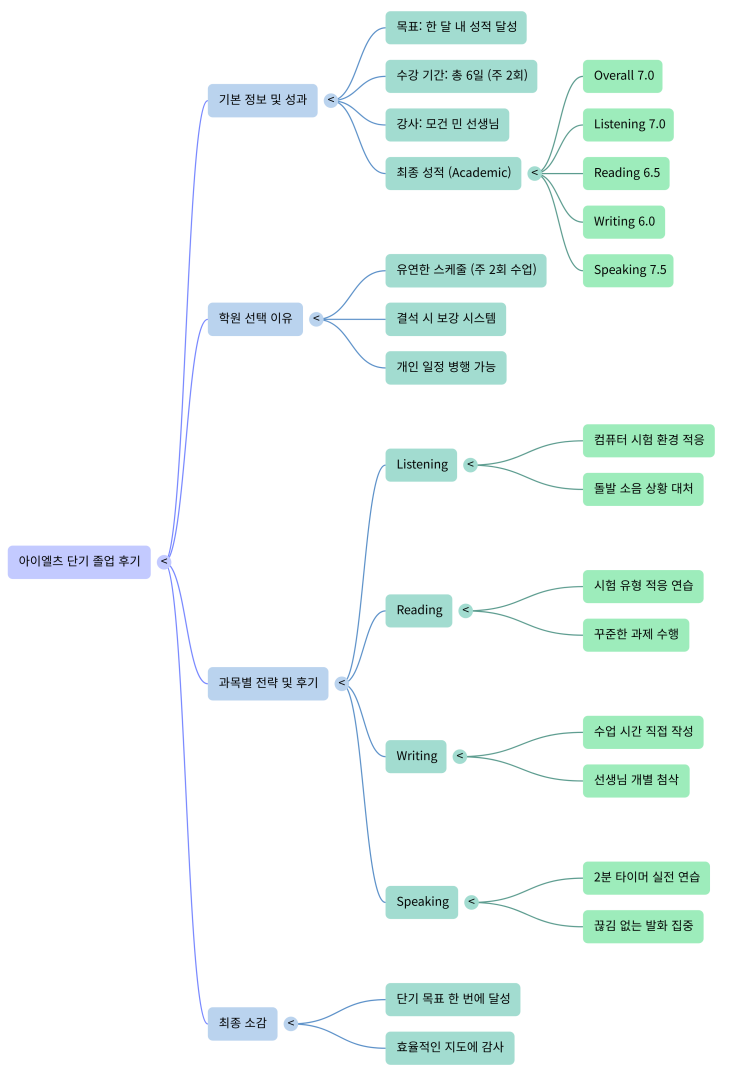 원래 시간여유를 가지고 독학하려다가^^ 한달 내로 급히 아이엘츠 성적이 필요하게 되어 학원을 알아보게 되었습니다. 결과적으로는 학원 없었다면 단기간에 원하는 점수 달성하기가 쉽지 않았을 것 같아 만족하고 있습니다!! 사실 처음에 알아보면서 대부분의 학원이 주말반이 아니면 월-금 주 5일이어서 부담스럽고 개인일정으로 인해 스케줄도 맞지 않았는데 이알피는 주 2회 수업이 가능하고 보강도 잡아주셔서 선택하게 된 것 같아요. 개인일정으로 인해서 2번이나 빠지게 된 것은 아쉬운 부분이지만 그래도 단기간에 나쁘지 않은 성적을 받을 수 있었던 것도 학원 수업 덕분인 것 같습니다. 학원 수업 총 6일 받고 아카데믹 Overall 7.0 / ....... <img src="https://blogthumb.pstatic.net/MjAyNjA0MTRfMjMx/MDAxNzc2MTUwMjc2NjU0.gMXJTJgRfN-VN3Xbb_6k7hephl_S2MskNDVQiFtseTEg.Vk1FIhYOVVG39p2st5ce0J2hUZ3k0E3ZdN1tBljCO_Eg.PNG/NotebookLM_Mind_Map.png?type=s3" />