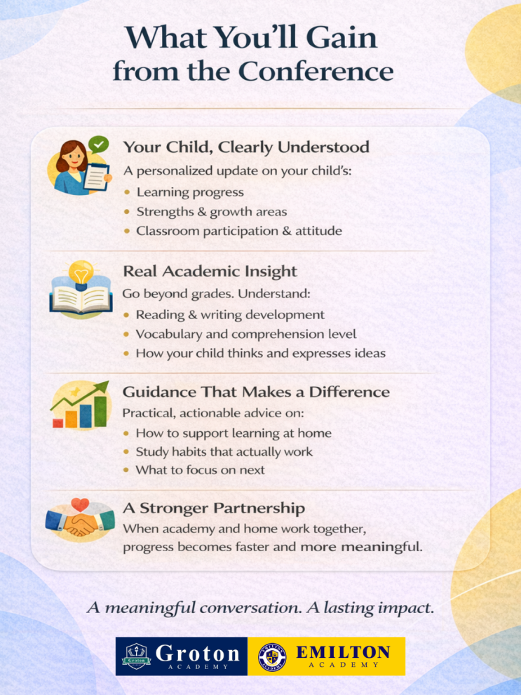 안녕하세요, 그로튼 에밀튼입니다 학부모님과 함께 아이의 성장 과정을 나누는 Parent Teacher Conference가 시작됩니다. 진행 일정 4월 22일 – 4월 30일 (*4월 25일, 27일, 28일은 상담이 진행되지 않습니다) 이번 간담회는 아이의 현재 모습을 함께 이해하고, 앞으로의 방향을 함께 고민하는 자리입니다. 단순히 결과를 전달하는 시간이 아니라, 아이의 학습 과정과 변화까지 구체적으로 나누는 시간을 준비했습니다. 간담회에서 확인하실 수 있는 내용 ✔ 현재 학습 수준과 이해도 ✔ 수업 참여도 및 학습 태도 ✔ 리딩을 포함한 전반적인 성장 과정 ✔ 아이의 강점과 보완이 필요한 부분 이를 통해 아이에 대해 보다 깊이 있....... <img src="https://blogthumb.pstatic.net/MjAyNjA0MjBfMTEw/MDAxNzc2Njc2OTA1NDk2.kyAv0aOQqAUqsBxHXKL7dVYOB4BqMIW7eieDv2M8V0Eg.sqRTuA3i3r4jQDhiBP9D2GkpUSNOMzzGWDpdI8GE1cMg.PNG/2.png?type=s3" />