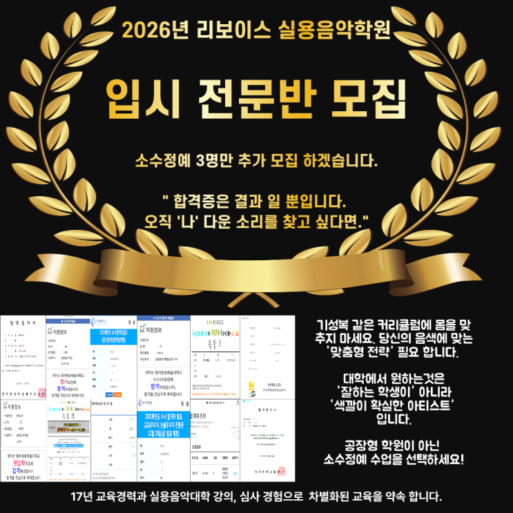 보컬 입시, 왜 '보컬 전문' 학원이어야 할까? 의령·밀양·진주에서 창원까지 찾는 이유 안녕하세요! 창원 리보이스실용음악학원입니다. 실용음악과 입시 시즌이 다가오면 의령, 밀양, 함안, 용원, 진주 등 경남 전역에서 많은 입시생과 학부모님들이 고민에 빠집니다. "가까운 종합 실용음악학원을 갈까, 아니면 전문성을 갖춘 곳을 찾아갈까?" 오늘은 보컬 입시를 준비하는 학생들을 위해, 왜 **'보컬 단일 과목 전문 교육'**이 입시 전략에서 압도적인 차이를 만드는지, 그리고 리보이스만의 실전 중심 커리큘럼을 소개해 드리고자 합니다. ✨ 1. 보컬 단일 전공 시스템의 치명적인 장점 많은 학원이 피....... <img src="https://blogthumb.pstatic.net/MjAyNjA0MjBfMTUy/MDAxNzc2NjU2MDcxMjE5.46wC6cxm82GzmqX46nMr31NruRbihUx7Wq5OkHrtlQwg.xo4uhUV0aeXsXxn1OMaSKFmxG4fY3rsFh9yESwmQZH0g.PNG/260311.png?type=s3" />