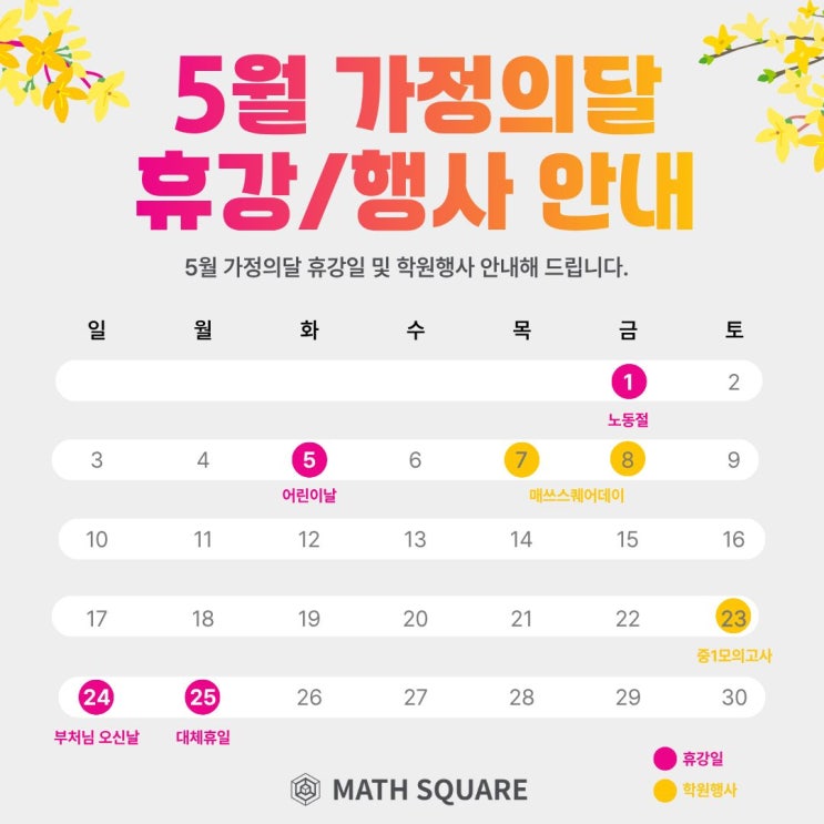 안녕하세요 문정동 가락동 수학학원 매쓰스퀘어수학학원입니다. 5월은 법정공휴일과 어린이날, 대체공휴일 등 일정 변동이 많은 시기인만큼 학부모님들의 문의가 많아 미리 안내 드립니다. 단순 일정 안내를 넘어 왜 이런 운영을 하는지 까지 함께 설명드리겠습니다. 5월 휴강 안내 5월 1일(금): 노동절 휴강 5월 5일(화): 어린이날 휴강 5월 25일(월): 대체공휴일 휴강 의무보강 안내 의무보강은 수업시수 부족으로 인한 보강을 말합니다. 학원에서 가장 중요하게 생각하는 것은 학습의 연속성 입니다. 초등~중1 월수금/화목반 모두 의무보강 1회씩 진행합니다. 초등 및 중1 시기는 개념이 무너지면 이후 과정이 모두 흔들리는 시기입니다. 따라....... <img src="https://blogthumb.pstatic.net/MjAyNjA0MjJfMjk1/MDAxNzc2Nzg5NDk2MTY4.U1kDRe93ZyiPHf7qbdqxEdPfFc3uxrHdecIwb5f7cqIg.cXTuanIAfD1eDo-XeBdQyPSy1pIN2H9v5NRz2qOalq4g.JPEG/5%BF%F9_%C8%DE%B0%AD%C7%E0%BB%E7.jpg?type=s3" />