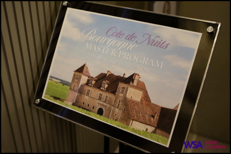 안녕하세요! 국내 최고의 국제 인증 와인 교육기관 WSA와인아카데미입니다. 완연한 봄기운이 찾아오는 3월, 부르고뉴의 심장이라 불리는 꼬뜨 드 뉘를 깊이 있게 탐구하는 Bourgogne Master Program - Côte de Nuits 후기를 전해드립니다. 피노 누아의 정수를 가장 정교하게 표현하는 지역, 꼬뜨 드 뉘의 테루아를 집중적으로 분석해 본 그 특별한 현장을 지금 바로 만나보시죠. < 백은주 대표 강사님 > 부르고뉴 와인의 깊이를 가장 정확하게 짚어내는 백은주 대표 강사님의 강의로 진행된 이번 클래스! Marsannay부터 Vosne-Romanée까지, 각 빌라주별 토양과 미세한 차이가 어떻게 스타일로 이어지는지 명확하게 정리해 주시는 설명에 수....... <img src="https://blogthumb.pstatic.net/MjAyNjA0MTJfMjE2/MDAxNzc1OTY2Mzk4Njkz.UDuNHEHYx5Fvu7pIy3QnHO7YNQ70Jp_RxZ_KLjc9o5Yg.dbT_t2tiNW7mduYaUFc_4nazKHQXFXdFHfm5h3FKkEkg.JPEG/_MG_1404.jpg?type=s3" />