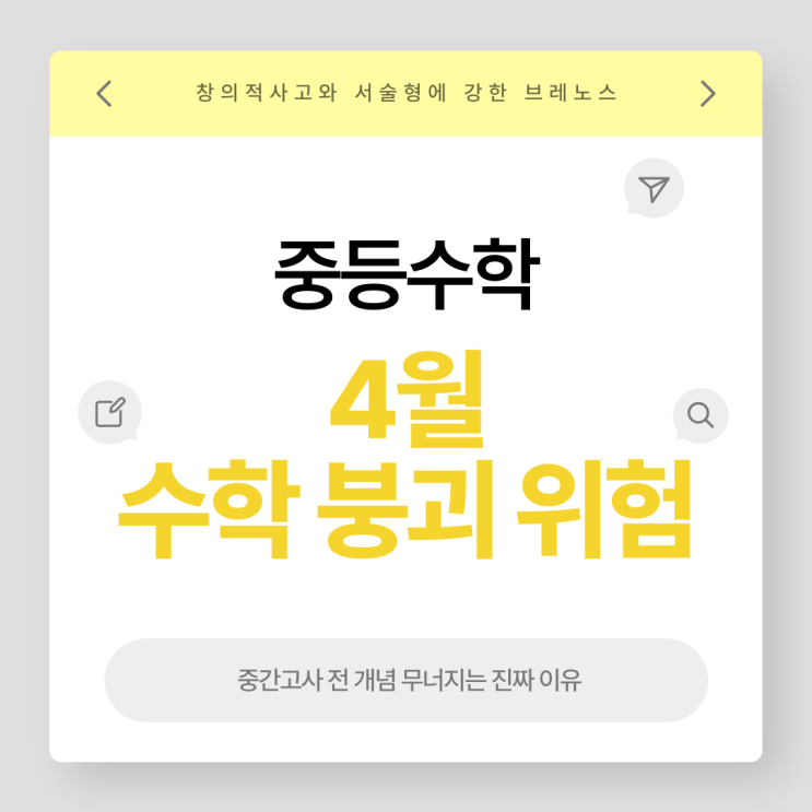 중학교 수학, 4월에 무너지기 시작하는 이유 중학교 수학 성적은 언제부터 갈릴까요? 많은 분들이 중간고사 이후를 떠올리지만, 실제 현장에서는 4월부터 이미 격차가 시작됩니다. 중학교 수학은 초등과 달리 단순 계산이 아니라 ‘식과 개념을 이해하는 구조형 과목’으로 바뀌기 때문입니다. 특히 1학기 초반에 배우는 문자의 사용, 식의 계산, 방정식은 이후 모든 단원의 기초가 됩니다. 이 시기에 개념이 제대로 잡히지 않으면 시험 점수뿐 아니라 수학 자신감까지 흔들릴 수 있습니다. 그래서 4월은 단순히 열심히 하는 시기가 아니라 학습 방향을 정확히 잡아야 하는 시기입니다. 왜 4월부터 무너지기 시작할까요? 1. 개념이 연결되는 구조....... <img src="https://blogthumb.pstatic.net/MjAyNjA0MjFfMTcy/MDAxNzc2NzE1MjAzNTYx.LBGgvk_YnewUyDYFIfwOaDH2_Ln29uKgGdXfE7Fl5BAg.L-AEcA5x5iZ-e5MKDZKYMiWfCOusqAEVMF-K3UTtnHwg.PNG/001.png?type=s3" />