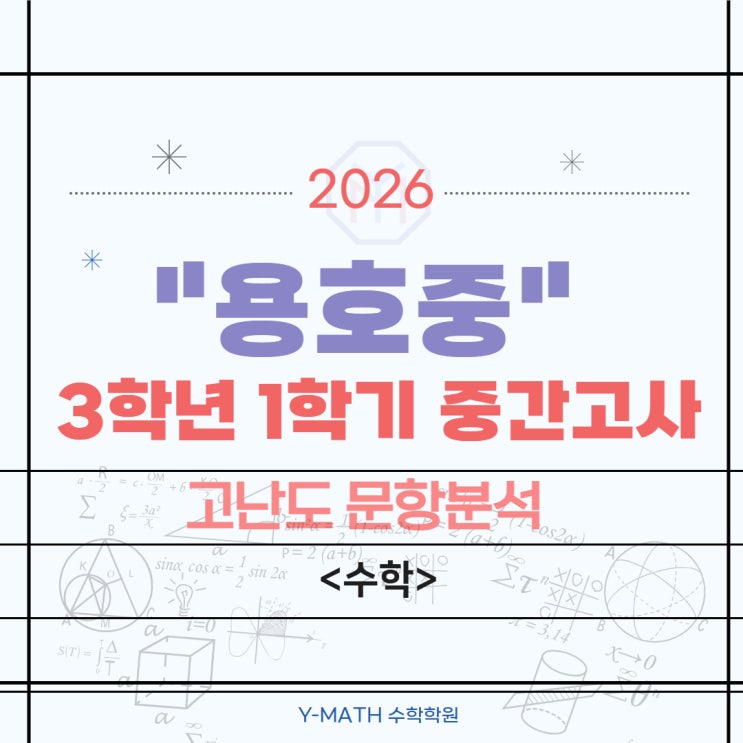 안녕하세요 여러분! 여러분의 시험기간 도우미! 와이매쓰 수학학원입니다. 중간고사 기간이 슬슬 마무리 단계에 접어들었습니다. 여러분 모두에게 좋은 결과였기를 진심으로 바래요. ^^ 혹시 결과가 마음에 들지 않는다? 와이매쓰의 문을 살짝 두드려보는거, 추천합니다! ㅎㅎ 오늘은 2026년 용호중 3학년 1학기 중간고사 수학을 분석해보려고 해요. 선생님이 생각하는 이번 용호중 3학년 중간고사는, "교과서가 중심, 기본에 충실, 실수 조심!" 이라고 요약해볼 수 있을 것 같습니다. 교과서와 문제집에서 한 번쯤 봤던 유형들이었고, 그 유형에서 한 발짝 정도 나아간 정도였어요. 그래서 항상 시험기간에 교과서 공부를 강조한다는....... <img src="https://blogthumb.pstatic.net/MjAyNjA0MzBfMjEg/MDAxNzc3NTI0NDI2MDkw.1Eb99UW1vdIxIxn0mhGk_CAGs-LYAjLctVmWFh0r_D8g.aZc745a46QrzNkmSrIgl4jDzUHhKCh2vChJuomiXYRAg.JPEG/%BF%EB%C8%A3%C1%DF3.jpg?type=s3" />