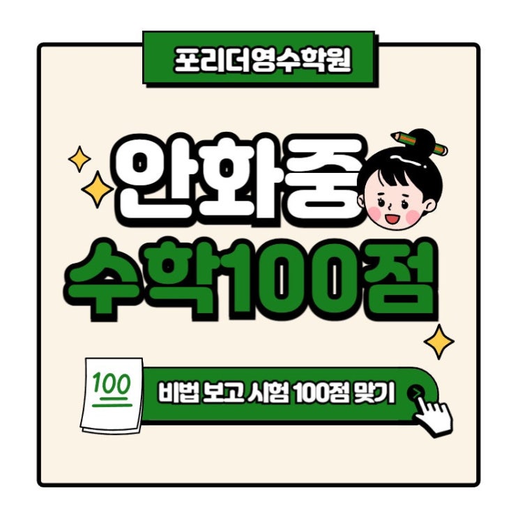 2026년도 안화중 3학년 1학기 1차 지필평가 수학 100점 달성! 안녕하세요, 포리더 영수학원입니다 아이들이 열심히 준비한 내신 대비가 끝났습니다! 이번 안화중 3학년 1학기 중간고사 수학 시험에서 우리 학원 학생이 무려 ‘100점’이라는 뛰어난 성과를 얻었습니다❤️ 성실히 수업에 임해온 결과가 정확하게 성적으로 나타나 너무 자랑스럽고 기쁘네요 열심히 함께 따라와준 우리 학생들 고생 많았어요~~☺️ 결과는 과정이 만듭니다✍️ 이번 시험 100점의 주인공은 평소에 꾸준함이 돋보이던 학생이었습니다. 선행이 되어 있음에도 기본을 소홀히 하지 않았고, 복습과 숙제를 성실하게 이어가며 수업에서도....... <img src="https://blogthumb.pstatic.net/MjAyNjA0MjlfMjc5/MDAxNzc3NDU5ODY3OTMy.hZHNGuSxOWKUGHSS9fPWxhtjpzJ1DYvMPgR7hfjfZMIg.tcX8QoUnRzFmZ-t5U13_vJltv4RcHDDjL4d424JuL-kg.JPEG/IMG%A3%DF7511.JPG?type=s3" />