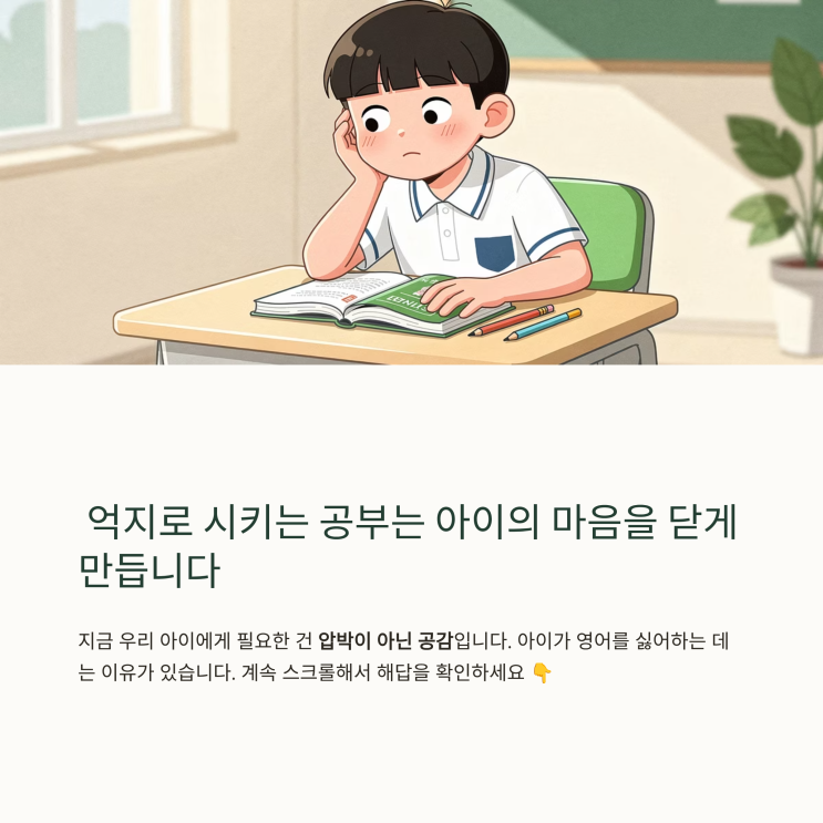 "영어 책만 펼치면 하품하고 딴짓해요." "억지로 학원 보내면 입이 툭 튀어나와 있어요." 대한민국 학부모님들의 90%가 한 번쯤은 겪어본 고민이죠. 사실 아이들이 영어를 싫어하는 건 머리가 나빠서가 아니에요. 그저 영어라는 '벽'이 너무 높고 재미없게 느껴지기 때문이거든요. 저도 학원에서 수많은 아이들을 만나보니 답은 정해져 있었어요. 방법만 바꾸면 "영어 더 하고 싶어요!"라는 말이 나오게 할 수 있습니다. 오늘 그 특급 비법을 살짝 공개해 드릴게요! 억지로 시키는 영어, 뇌가 문을 닫아버려요 공부하라고 등 떠밀수록 아이들의 뇌는 방어 기제를 작동시켜요. "영어 = 괴....... <img src="https://blogthumb.pstatic.net/MjAyNjA0MTNfOTAg/MDAxNzc2MDg0MzA0NDg0.uyDBGZlFoLIXW1rmQfUMVWEj014eZRuSFq02Nv8W6AYg.Ezb6SF9bMs24U-j5xEfXFp_L_9WUj9BjcYPxbJEUvTkg.PNG/1_.png?type=s3" />