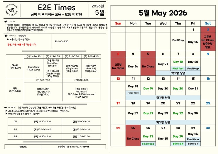 금정구 구서동 영어학원 이투이어학원 5월 수업 일정표 안내