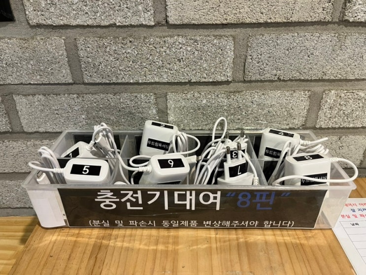 두드림독서실은 이용 편의를 위해 충전기를 구비하고 있습니다:) • C타입 / 8핀 구분 비치 • 번호 부착으로 관리 • 사용 후 제자리 반납 필수 쾌적한 이용 환경을 위해 사용 후 당일 반납 부탁드립니다 이용해주셔서 감사합니다 <img src="https://blogthumb.pstatic.net/MjAyNjA0MjJfMTk1/MDAxNzc2ODI1MTMwMjg2.-EHoPeYSvrYE-S-OvBOSF9jMA8vSwEUDqjMcaevjBDwg.DJHKJZba7e87fmOS50gXUArLHfz36N7olNgNUqsZmsAg.JPEG/IMG%A3%DF8199.jpg?type=s3" />