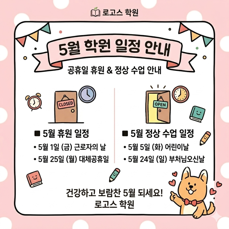 안녕하세요, 로고스 학원입니다 :) 다가오는 5월 학원 일정을 안내드립니다. ✔ [5월 휴원 일정] - 5월 1일 (금) 근로자의 날 - 5월 25일 (월) 대체공휴일 ✔ [정상 수업 일정] - 5월 5일 (화) 어린이날 - 5월 24일 (일) 부처님오신날 위 일정 참고하시어 학습에 차질 없도록 부탁드립니다. 요즘 우리 학생들, 중간고사를 앞두고 정말 중요한 시기를 보내고 있습니다. 지금의 하루하루가 모여 결과를 만든다는 걸 알기에 묵묵히 자리를 지키는 모습이 참 대견합니다. 그리고 그 뒤에서 늘 응원해주시고 든든하게 뒷받침해주시는 학부모님들께도 진심으로 감사드립니다. 조금만 더 힘내면, 분명 좋은 결과로 이어질 거예요 5월은 ‘가정의 달....... <img src="https://blogthumb.pstatic.net/MjAyNjA0MTdfMTMg/MDAxNzc2NDE3Nzg1ODky.fXAv2uSBBFpQXT1DRTEt4Tluri5Fk_j1W6ST7jTASEcg.WdMLbDPfljiSkMDRHUrI6RGJqCk7YdnOiFien_KnDsYg.PNG/KakaoTalk_20260417_181136141.png?type=s3" />