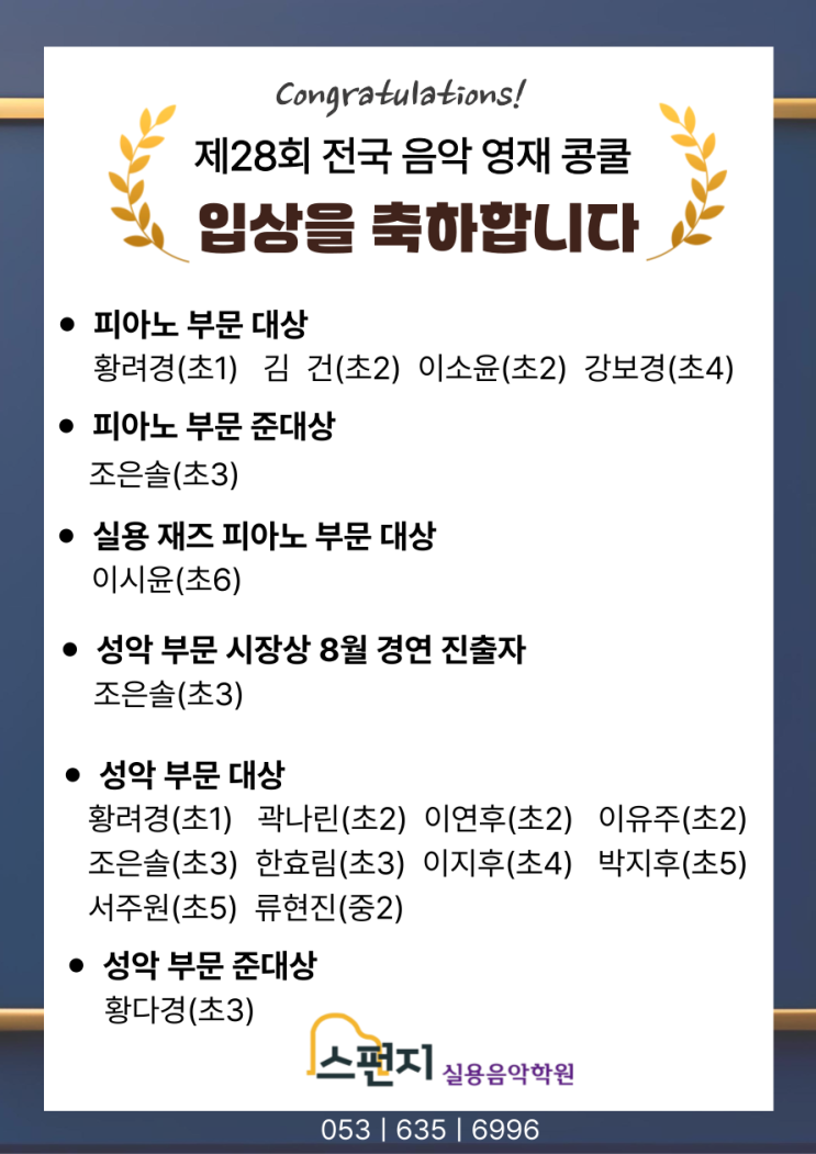 제28회전국음악영재콩쿨/시장상콩쿨/앞산청소년수련원/입상을진심으로축하합니다!!/스펀지실용음악학원