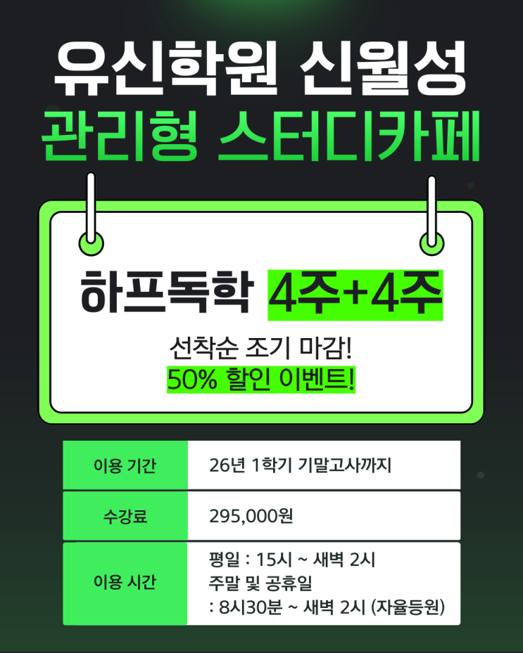 기말고사 앞두고 “이번엔 진짜 열심히 해야지” 생각하지만 막상 집에서는 잘 안 되는 경우 많죠 그래서 유신학원에서는 시험기간 동안 제대로 집중할 수 있도록 하프독학 50% 할인 이벤트를 준비했습니다 !!!!! 하프독학 4주 + 4주 이벤트! 기말고사까지 충분히 대비할 수 있는 총 8주 집중 학습 기회입니다 ⚡ SPECIAL EVENT 단과 동시 수강생 추가 할인 혜택! ✔ 단과 1과목 수강 시 → 5만원 할인 ✔ 단과 2과목 수강 시 → 10만원 할인 ⏰ 이용기간 2026.5.11(월) ~ 2026년 1학기 기말고사 종료일까지 이용대상 고1·고2·고3 재학생 운영시간 평일 : 오후 3시 ~ 새벽 2시 주말/공휴일 : 오전 8시 30분 ~....... <img src="https://blogthumb.pstatic.net/MjAyNjA0MTRfNTAg/MDAxNzc2MTY4MTYzNzQ4.EVcpS-906JG0nBQClCsU-4tag_HloZMRPZkJ8-2xiOkg.IU4bICMhtYzcVLw4PL851JJkahhfQsLe53Cxk2ug9yog.PNG/001.png?type=s3" />