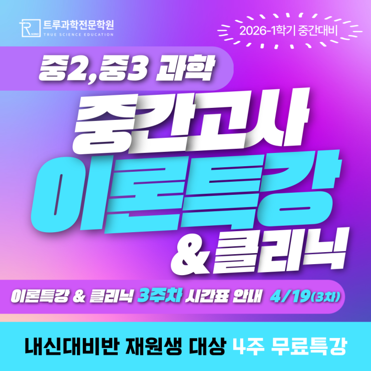 [대구 과학학원] 트루과학학원_2026년 1학기 중간고사 내신대비 - 중3 과학 <이론특강 & 개별 클리닉> 3주차 안내 (재원생 대상 무료)
