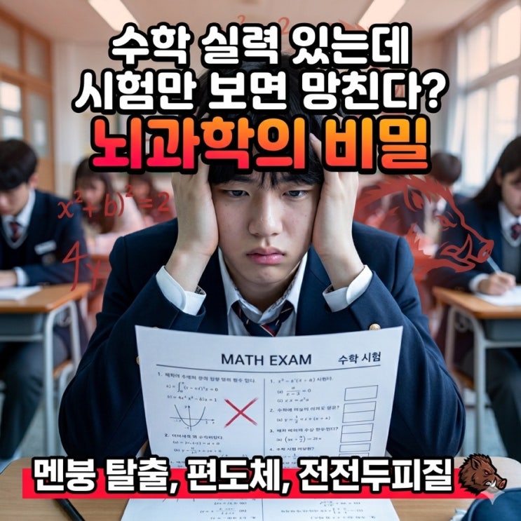 수학 실력은 있는데 시험만 보면 망친다? 뇌과학이 밝힌 ‘수학 멘탈’의 비밀 현장에서 아이들을 가르치다 보면 유독 가슴 아픈 순간이 있습니다. 평소 실력은 충분한데, 시험지만 받으면 유독 얼어붙는 아이들을 볼 때입니다. "선생님, 평소에 다 알던 건데 시험장에서는 멘붕이 와서 아무것도 안 보였어요." "분명히 배운 개념인데, 낯선 유형만 나오니까 숨이 턱 막히면서 생각이 멈춰버렸어요." 아이들이 겪는 이 '머릿속이 하얘지는 현상'은 단순한 실수가 아닙니다. 뇌과학적으로 보면, 우리 아이들은 지금 '수학 시험지'를 '나를 공격하는 멧돼지'로 인식하고 있는 것입니다. 최근 연....... <img src="https://blogthumb.pstatic.net/MjAyNjA0MTdfNDUg/MDAxNzc2NDEyMzY0MjIw.emSOZRxU4PtOwfKKSONl5c2rui1QuUWgIA5a-7QVXMUg.NsDumubntvGtW3QD8uBQVK911Tz8Wkt5lh7Sj3flipsg.JPEG/IMG%A3%DF5600.jpg?type=s3" />