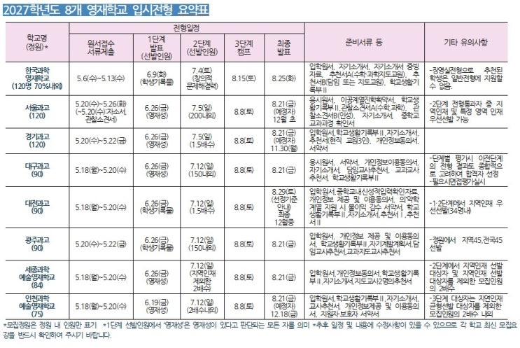 2027학년도 8개 영재학교 입시전형 요약표 (출처=각 학교 모집요강) 2027학년도 전국 8개 영재학교 모집요강이 공개된 가운데, 전체 모집 정원은 789명으로 전년과 동일하게 유지됨. 다만 전형별 세부 인원에는 변화가 나타났다. 대전과고는 SW/AI 전형을 신설해 최대 9명을 선발하며, 해당 인원이 충족되지 않을 경우 일반전형으로 이월하는 방식이 적용됨. 한국영재학교 역시 장영실전형을 확대하고 일반전형을 축소하는 등 전형 구조에 변화를 줌. 지역인재 우선선발 규모는 유지됐으며, 한국영재를 제외한 7개교에서 총 307명을 선발. 학교별로 선발 방식에는 차이가 있고, 일부 학교는 기준을 완화하는 등 미세한 조정이 있었음. 이는....... <img src="https://blogthumb.pstatic.net/MjAyNjA0MjBfMjA5/MDAxNzc2NjQ4OTU5MDAz.5OIlGvEjA1L13r3VCHIXTpTj0_vhUW2qbjuGdxFZ-SMg.IgUD1PgnVvkDjyt2hIA2Y5RzVly8XZ8eYzfMW7qn6hAg.JPEG/%C8%AD%B8%E9_%C4%B8%C3%B3_2026-04-20_102539.jpg?type=s3" />