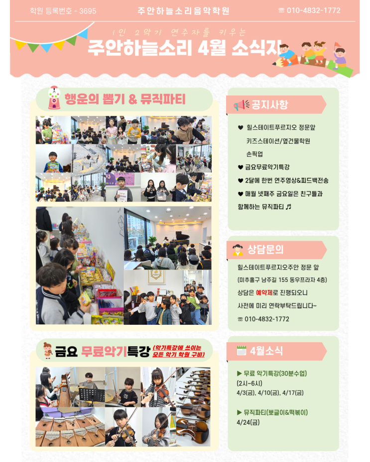 안녕하세요~ 주안하늘소리음악학원입니다. 4월 소식지가 나왔어요! 4월에는 뮤직파티와 행운의 뽑기를 통해 아이들과 즐거운 시간을 보냈습니다^^ 따사로운 계절이 다가왔네요 일교차가 큰데 건강 조심하시고 앞으로도 주안하늘소리음악학원의 소식을 기대해주세요 주안하늘소리음악학원 ️담임제 / 정원제 수업 ️금요무료악기특강 (바이올린/드럼/칼림바/리코더) ️매월 넷째주 금요일(뮤직파티) ️연습 보조 선생님 상주 ️ 2개월에 한번 영상&피드백 전송 ️등하원 출결문자 서비스 ️피아노/바이올린/드럼/기타 성인 개인레슨 유치부/초등부/중고등부/취미반/콩쿨반 《상담 예약제》 교육 문....... <img src="https://blogthumb.pstatic.net/MjAyNjA0MTNfNTMg/MDAxNzc2MDU5MzIyOTQw.LexBIekqO5i0uvhPMBo-cmUBAjV88CPTfoP5a98RyX0g.gpA7AqR9ET66FhIKYbW3L4J_Pjjp9pXTDQ6HqOUJe1Eg.PNG/%C1%A6%B8%F1%C0%BB_%C0%D4%B7%C2%C7%D8%C1%D6%BC%BC%BF%E4._%2823%29.png?type=s3" />