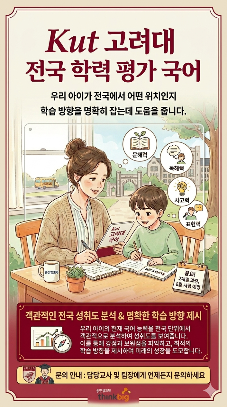 안녕하세요, 어머니^^ 올해 1월 국회에서 '독서국가' 선포한 사실을 알고계셨나요? 그에 맞게 웅진씽크빅에서는 우리 아이들의 문해력을 책임질 수 있는 다양한 학습플랜이 있답니다. 그중에서도 Kut 국어평가(문해력부문)에 대해 안내드려요. Kut국어는 전국단위로 실시되는 객관적인 평가를 바탕으로 운영되고 있어, 신뢰도 높은 결과를 제공합니다. 이를통해 우리 아이가 전국에서 어떤 위치에 있는지 객관적으로 확인할수 있어, 앞으로의 학습방향을 명확히 잡는데 큰 도움이 된답니다. 특히, 이 평가는 단순한 문해력을 넘어 독해력,사고력,표현력까지 폭넓게 평가하여 아이의 전반적인 국어 능력을 균형있게 키우도록 설계되어 있....... <img src="https://blogthumb.pstatic.net/MjAyNjA0MTdfMjE4/MDAxNzc2NDAzMDc1Mjg1.CVxqJQCCWl-mg5zsJjQINMiKIzVdBX32PwZa6uhiEnYg.GQlaihVkAwf1EhZkS9eJ_DdrmOKQWHMNki7bnpzz0Lwg.PNG/1776400383685.png?type=s3" />