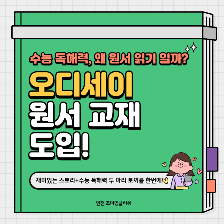 "영어를 잘 하는 아이들의 공통점, 많이 읽었다는 것입니다" 안녕하세요 :) 조이잉글리쉬 인천점 원장 이유미입니다. 조이잉글리쉬에서 오랜 시간 고민하고, 야심차게 준비한 오디세이 원서 프로그램을 드디어 선보이게 되었습니다! 오늘은 영어 원서 읽기가 가진 힘과 조이잉글리쉬의 원서 수업 과정을 보여드리겠습니다. "고등 영어 독해는 차원이 다르다던데.." "수능 영어는 미리 끝내야 한다던데.." 초중등 자녀를 둔 학부모님이라면 수능 영어에 대한 고민 한번쯤 해보셨을 겁니다. 그런데 고등학교에 가서 긴 영어 지문도 막힘없는 읽어내는 아이들이 있습니다. 이 아이들의 비결은 무엇일까요? 이 아....... <img src="https://blogthumb.pstatic.net/MjAyNjA0MTJfMTQy/MDAxNzc1OTg0NTY3OTIz.ydj9uq8NSfYJS6B2d3_7FLEosjCClJVqLSZwraPPrdAg.tzlGCpVrZRRUyMIsy0syEmuhSsRhp0LRT1xhMQ1NNKog.PNG/%C1%B6%C0%CC%C0%D7%B1%DB%B8%AE%BD%AC-012.png?type=s3" />