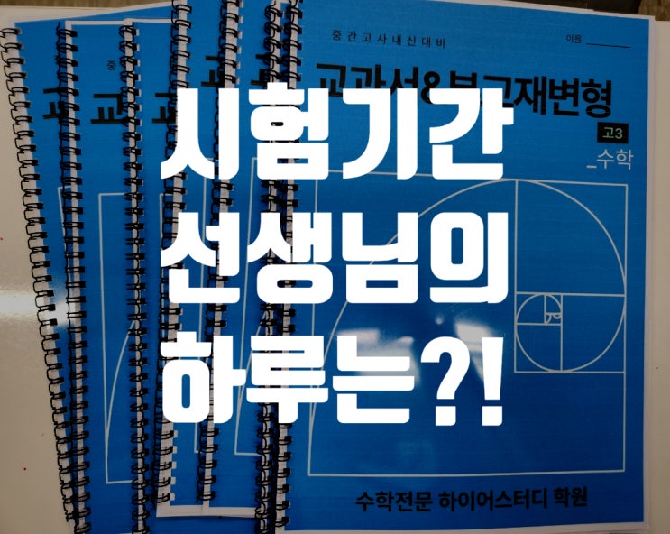 안녕하세요. 하이어스터디 원장, 나미쌤입니다:D 새학기가 된지 엊그제 같은데 벌써 중고등부 중간고사 시험이 2주정도 남았네요. 오늘은 시험기간 나미쌤의 하루가 어떻게 흘러가는지 보여드리려합니다. 더불어 우리 아이들은 어떻게 중간고사를 대비하고 있는지도 알 수 있을거에요~ 오전 업무는 교재 제작하기! 요즘은 오후에 출근하지 않고 오전에 출근을 하고 있어요. 바로 아이들 교재 제작 때문!! 중학교&고등학교에 학교도 여러개이고 부교재&학습지 변형 문제까지 제작하고 인쇄하려니 오전 출근이 아니면 업무를 다 할 수 가 없겠더라구요. 오늘도 일찍 출근해서 오늘 계획한 고3아이들 교재를 제작했습니다. 다 만들고 나니 엄....... <img src="https://blogthumb.pstatic.net/MjAyNjA0MTNfMjgy/MDAxNzc2MDYzOTc3MDYw.4ccqo5HlAwlXQM9h3jTtXUPmE0O4B7OpMVPM8tp_jk8g.TNrD8v5mzIchv3z869VXUxMUaKQ9lGkt5vPxKJ8hyW8g.JPEG/900_20260413_125057.jpg?type=s3" />