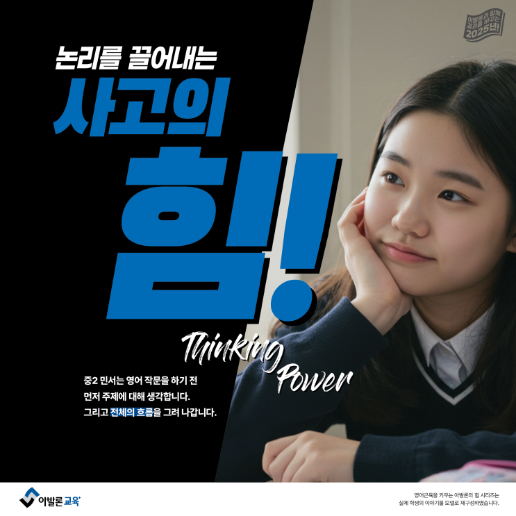 뭐라고 써야 할지 막막해요. 과거, 민서는 영어 작문 시간만 되면 샤프를 쥔 채 그대로 얼어붙었습니다. “쓰려고만 하면 아무것도 안 떠올라요.” 무슨 단어를 써야 할지, 문법에 오류는 없는지 내용은 어떻게 채울지 막막했고 결국 두세 줄 겨우 적고 끝나는 일이 반복됐습니다. 민서 같은 아이들은 정말로 글을 못 써서 힘든 걸까요? 그렇지 않습니다. 다만, 영어로 사고하는 훈련이 되지 않았기 때문입니다. 아발론 교육의 힘 2편 논리를 끌어내는 사고의 힘 논리를 끌어내는 사고의 힘! Thinking Power 올해 중2가 된 민서는 이전처럼 샤프를 쥐고 전전긍긍하지 않습니다. 주제부터 정하고 차분하게 생각하자. 민서는 주제에 대해 먼저 생각....... <img src="https://blogthumb.pstatic.net/MjAyNjA0MTRfMTQ1/MDAxNzc2MTU2NDk4MjIz.gDPm6gwwGsEfXZ4Ks0EPZWWCLbge15Km_8btfpL1RjIg.sggeLfLocOIJbqHRNx2M1Jj1AB3XgjNCC6eiWHghVKEg.PNG/KakaoTalk_20250730_154542888.png?type=s3" />