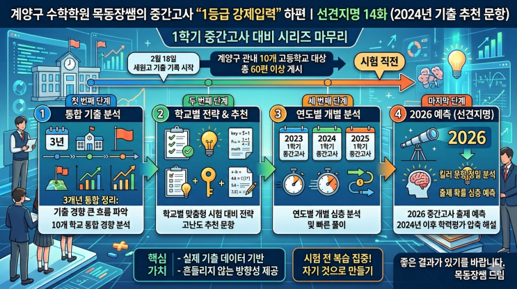 그동안의 1학기 중간고사 대비를 위한 전체 시리즈를 마무리합니다. 이 글을 올리는 시점, 2026년 1학기 중간고사가 며칠 앞으로 다가왔습니다. 돌아보면 지난 2월 18일 세원고 기출 경향 기록을 시작으로, 오늘까지 계양구 관내 10개 고등학교를 대상으로 총 60편이 넘는 글을 순서대로 게시해 왔습니다. [ 시리즈 전체 흐름 ] 첫 번째 단계에서는 10개 학교 각각의 수학 내신 기출을 3개년 단위로 통합 정리하여 출제 경향의 큰 흐름을 기록했습니다. 두 번째 단계에서는 학교별 시험 대비 전략과 고난도 문항 추천을 정리했고, 세 번째 단계에서는 2023년·2024년·2025년 1학기 중간고사를 연도별로 개별 분석하고 빠른 풀이를 제공했습니다. 그....... <img src="https://blogthumb.pstatic.net/MjAyNjA0MjZfNTcg/MDAxNzc3MTQ3MTQ3Nzg3.f6pz4hBila8_U9Bra4D4RO7JPJ367JhRf5HKgku50Z0g.fBOCDv0E9qY2L7-0HcFetHVgWg9MdjdcEpyIN9nwkegg.PNG/2024%B3%E2_%B0%ED1_%C0%FC%B1%B9%BF%AC%C7%D5%C7%D0%B7%C2%C6%F2%B0%A1_%BC%D2%B0%B3%B1%DB.png?type=s3" />