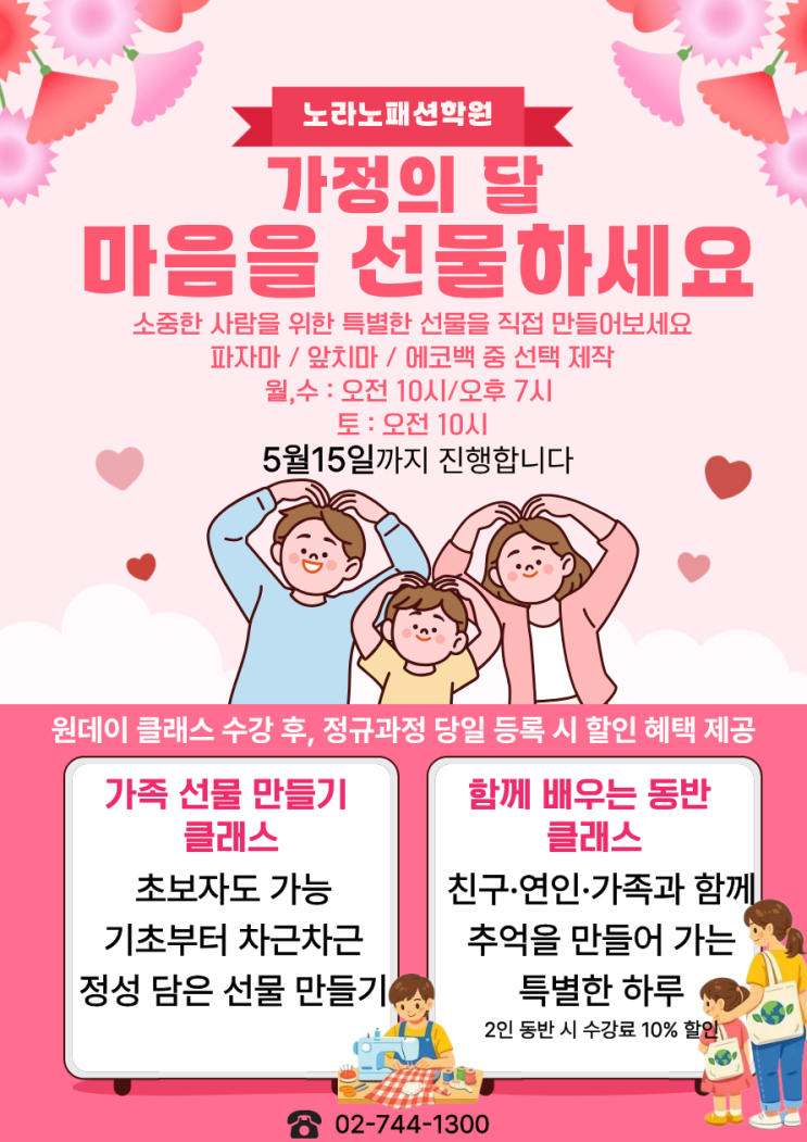 5월 가정의 달, 조금 더 특별한 선물 준비해보세요 안녕하세요, 노라노패션학원입니다 :) 다가오는 5월, 어떤 선물을 준비하고 계신가요? 이번에는 사는 선물 대신, 직접 만들어보는 건 어떠세요? 노라노패션학원에서는 초보자도 참여 가능한 원데이 클래스를 통해 파자마, 앞치마, 에코백을 직접 제작하실 수 있습니다. ✔ 수강료 안내 원데이 클래스 5만원 (재료비 별도) ✔ 가족 선물 만들기 클래스 혼자 참여하여 소중한 분께 드릴 선물을 직접 제작 ✔ 함께 배우는 동반 클래스 친구, 연인, 가족과 함께 참여하여 추억과 결과물을 동시에 만드는 시간 ✔ 이벤트 혜택 2인 이상 동반 참여 시 수강료 10% 할인 원데이 수강 후 정규과정 등....... <img src="https://blogthumb.pstatic.net/MjAyNjA0MjBfMjMz/MDAxNzc2NjcxMjM5NjQ0.hc5RiYJRipqWbec1ikWygsTFEz3JOOqOzs4lCt1u9Dwg.TdvFYMrG-kWy6VSiaV9qe6G4hqpTkw1_wW-kip7XGS4g.PNG/5%BF%F9_%C0%CC%BA%A5%C6%AE.png?type=s3" />