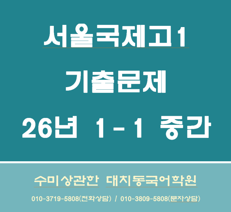 안녕하세요 수미상관한 대치동국어학원입니다. 서울국제고 1학년, 2학년은 오늘 중간고사 시험이 끝납니다. 더 열심히 준비한 학생, 더 오래 전부터 준비한 학생들이 좋은 점수와 결과를 얻었을 겁니다. 개인마다 실력의 차이가 있기 때문에 한 번에 뒤집는 것은 쉽지 않지만, 1학년 1학기 중간고사 결과를 받아들이고, 지금부터 꾸준히 노력하면 1등급으로 마무리할 수 있습니다. 서울국제고 1학년 (금) 5시 30분 ~ 9시 30분) 서울국제고 2학년 (토) 10시 ~ 2시 / (토) 5시 ~ 9시 서울국제고 3학년(정시반) (일) 10시 ~ 2시 1학년 기말고사에는 공통국어1에 나오는 나머지 단원이 시험범위입니다. 특히 '문법요소'는 중학교때 배웠던....... <img src="https://blogthumb.pstatic.net/MjAyNjA0MjRfMTA5/MDAxNzc3MDAwNjUxMzc5.4nEFAEA-nPe-JgULg3V5ffCLxoigPcbe1dWMdgNE--Ag.n5Xn6z1FSJ1mzyqciu64QsJgJqRFsX2vepP-eFK7sLcg.PNG/%BD%BA%C5%A9%B8%B0%BC%A6_2026-04-24_121159.png?type=s3" />