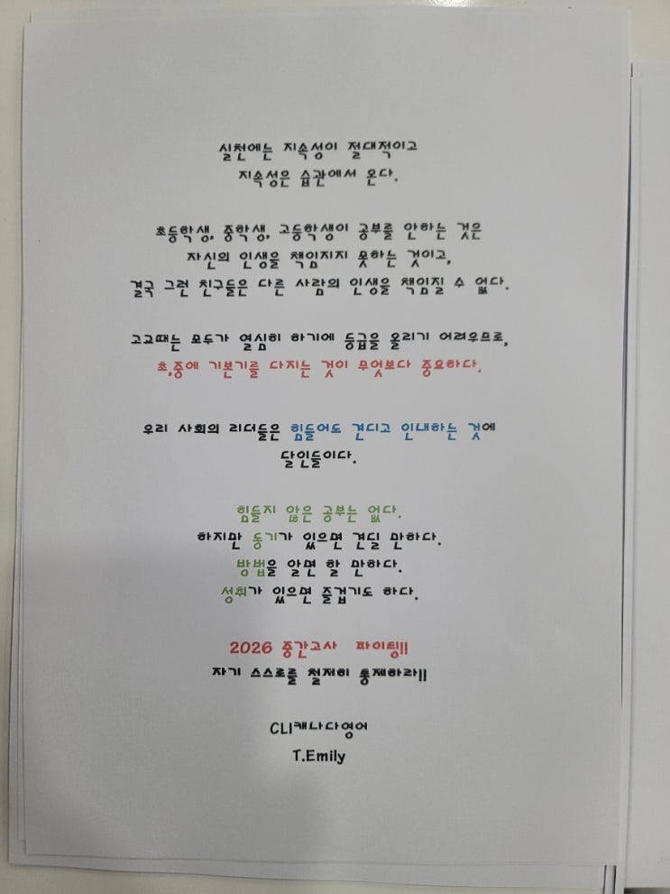 안녕하세요? CLI 영어 Mentor.Emily 입니다. 이번주부터 구산중학교 본격적인 시험기간 돌입했네요. ^^ 토요일 저녁 8시까지 프린트 만들고, 일요일 준비한 프린트 자료로 보강수업하고 열심히 보내고 있어요. 5년마다 개정되는 교과서로 다시 분석을 다 하고 기출문제 다 엎어지고 아주 맨땅에 헤딩을 하는 기분이네요. 그래서 교과서 분석과 사술형 나올만한 문제를 혼자서 예상하고 한글 답안 영어답안 연습을 시키고 있습니다. 2022년 개정 교과서는 "요즘 교과서가 바뀌었다."가 아니라 수업 방향 전체가 바뀐거라서 학원 운영이나 수업 설계에도 상당히 영향이 큽니다. 핵심을 말씀드리자면 1. 문법에서===>의....... <img src="https://blogthumb.pstatic.net/MjAyNjA0MTJfMjgg/MDAxNzc2MDA1NjA5MTM5.IAt17XeSrEHIvG9Zqf5h9sQ1vFwFTS7Jv5-uECKUGkQg.iMEoxxeUkqcxscj-gPhJZ9PEEf3Sur8q6fC1ru9a4Gwg.JPEG/900_20260411_193307.jpg?type=s3" />