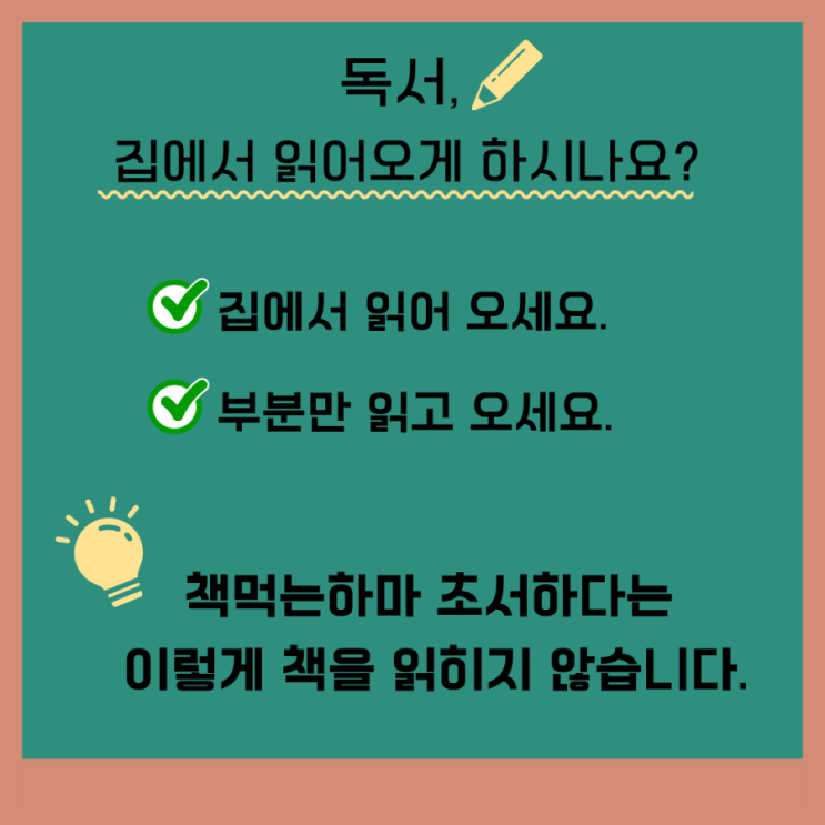 “책먹는하마는 집에서 읽어오게 하지 않습니다. 부분 발췌로도 읽히지 않습니다. 선생님과 함께 읽기–이해–정리–표현까지 전 과정을 함께합니다. 왜냐하면 아이를 ‘읽은 척하는 아이’로 만들고 싶지 않기 때문입니다.” “많은 독서 수업이 집에서 읽어오라고 합니다. 하지만 현실은 어떨까요? 읽지 않고도 읽었다고 말하는 아이가 생깁니다. 그 순간, 문해력 이전에 ‘학습 태도’가 무너집니다.” “책먹는하마는 아이를 잘 읽는 아이 이전에 정직하게 배우는 아이로 만듭니다.” “읽지 않고도 통과되는 수업은 문해력이 아니라 ‘읽은 척’을 가르칩니다.” “아이에게 책을 읽어오라고 했는데 정말 제대로 읽....... <img src="https://blogthumb.pstatic.net/MjAyNjA0MTZfMjE0/MDAxNzc2MjY1MjQwNTcy.ki7qeuUWve21xaUcfREUoq0GlGKbQZOwYU5ShGcNwf8g.IL6a5cyMp0Sl4BzSZoxDEVYZ4Rn3wr394ZA7DK7Lr-sg.PNG/900_1776263515089.png?type=s3" />