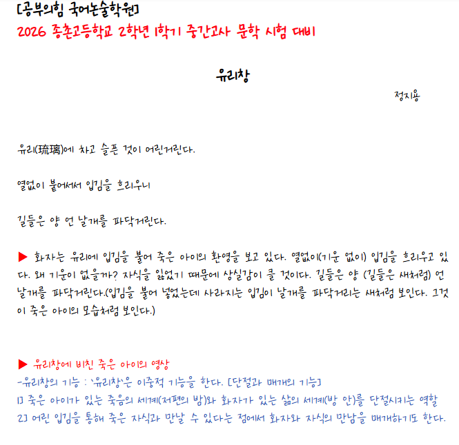 2026 종촌고등학교 2학년 1학기 중간고사 문학 시험 대비 [유리창-정지용]