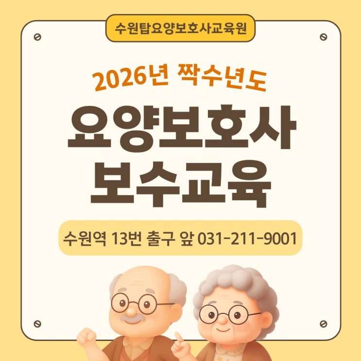 안녕하세요 수원탑요양보호사교육원입니다 본 교육원은 보수교육 실시기관으로 지정된 교육원입니다. 보수교육 신청방법 전화 혹은 네이버폼 신청서 작성 보수교육 일자 매월 셋째주 토요일 위치 수원역 13번출구 앞 031-211-9001 2024년부터 요양보호사 선생님들의 전문성을 높이기 위해 '보수교육(의무교육)' 제도가 생겼습니다. '저도 들어야 하나요?' '면제 대상자 인가요?' 헷갈려 하시는 선생님들이 많으신대요! 요양보호사 보수교육 대상자 현재 장기요양기관에 소속되어 (방문요양, 주야간보호, 요양원 등) 실제 근무중인 요양보호사 (가족요양도 해당됩니다) 딱 한가지만 기억하세요! 출생연도 끝자....... <img src="https://blogthumb.pstatic.net/MjAyNjA0MTZfMTQz/MDAxNzc2MzIzNTA5ODYy.SaTXpVZVHaTcRJzXBGSj9nojSbcqpNwlQkbJF6ctOT4g.6ybU_Hw5Oz8ll7mxNr1CT43XHHrWzO0XTfoxOsmP_fgg.JPEG/1.jpg?type=s3" />