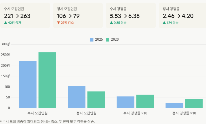 전체 모집 현황 비교 (2025 vs 2026) 수시 전형별 비교 [수시 주요 변화] 신설·폐지: 2026학년도에 학생부교과(교직적성우수자전형Ⅰ, 전남인재전형, 다문화전형)가 신설되고, 기존 학생부종합 전남인재전형은 폐지되었습니다. 사실상 학생부종합 단일 체계에서 교과+종합 이원화 체계로 전환한 셈입니다. 경쟁률 주목 변화: 농어촌학생전형이 4.70→9.90으로 두 배 이상 급등했습니다. 같은 모집인원(10명)에 지원자가 47명→99명으로 크게 늘었습니다. 광주인재전형은 5.73→3.86으로 하락했는데, 모집인원이 36→50명으로 늘어난 영향이 큽니다. 교직적성우수자 종합전형 예비번호가 77번→141번으로 크게 늘었습니다. 면접 결시자 66명이 발....... <img src="https://blogthumb.pstatic.net/MjAyNjA0MjVfMjY2/MDAxNzc3MDgxNzkzODI2.H6tVTTewP5uKlra_4EWa5mOk57d0Vt9Hjo9z5eaPb0Ag.-H30geXAfxLsgt6t8Ap_oIncTRJOPw4SZUrwk65zLVYg.PNG/image.png?type=s3" />