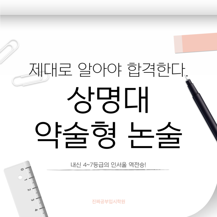 [2027학년도 대입 전형] 내신 4~7등급의 인서울 역전승! 상명대학교 약술형 논술 완벽 가이드 수도권 대학을 목표로 하는 중위권 수험생들에게 가천대, 국민대와 더불어 가장 매력적인 선택지로 꼽히는 학교가 바로 상명대학교입니다. 특히 내신 성적이 4등급에서 7등급 사이에 위치해 학생부 위주 전형으로는 인서울이 불투명한 학생들에게 '약술형 논술'은 그야말로 마법 같은 기회를 제공합니다. 2027학년도 입시를 준비하는 수험생과 학무모님들을 위해, 상명대 약술형 논술의 핵심 요강과 합격으로 가는 필승 전략을 상세히 정리해 드립니다. 1. 2027 상명대 약술형 논술의 핵심: "내신이 나빠도 제대로 준비만 하면 가능하....... <img src="https://blogthumb.pstatic.net/MjAyNjA0MjhfNTgg/MDAxNzc3MzU4MDMwMDU3.g-qbpkvuL-q9l1R1srj81bu4TcFGFaqZhxbQ5k7byvIg.4z79zQ6RqhjnbRw4X6F1LIpowgTcKit7Re4r_fhiQtkg.PNG/001.png?type=s3" />