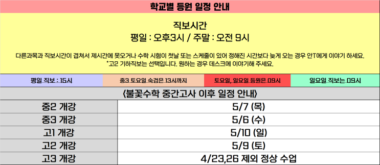 학교별 등원일정 안내 (1학기 중간고사)