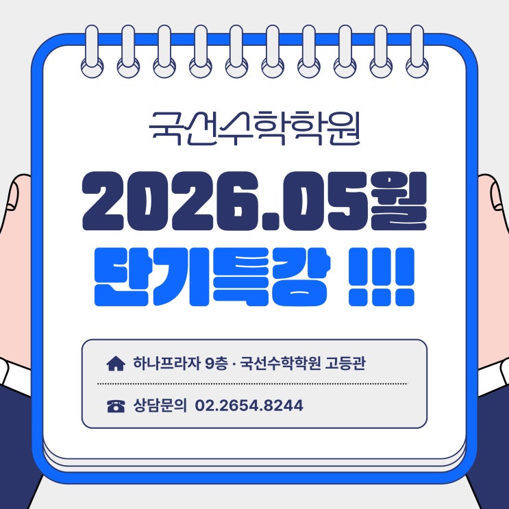 안녕하세요 국선수학학원입니다 따뜻한 봄날씨가 지속되는 가운데 국선수학에서 다가오는 5월 !!! 알찬 [ 단 기 특 강 ]을 준비했습니다 !!! 특강 일정 & 과정 아래 내용을 참고하여 신청해 주시면 감사하겠습니다 ☘️ 일정 5월 1일 (금요일) ~ 5월 5일 (화요일) 수업시간 오후 1시 ~ 5시 (4시간수업) 학년별 수업 과정 과정 · 회차별 수업 안내 * 모든 과정 회차별 수강 선택 가능합니다 * 국선수학학원은 언제나 최선을 다해 좋은 수업을 준비하겠습니다 상담문의 · 예약 02-2654-8244 구글폼 신청 https://forms.gle/wN2AKh1qfNMmZL386 <img src="https://blogthumb.pstatic.net/MjAyNjA0MDhfODEg/MDAxNzc1NjIyMzE4Nzc5._6AOfkApiOzPlinyO87wClZRQi9_fUnj6nD9rCs3bakg.2vjtYdUJSiXxjZY9dpVaZdyluP5W9xYq0Yk7q2E30t0g.JPEG/%B4%DC%B1%E2%C6%AF%B0%AD.jpg?type=s3" />