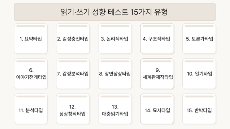 “아이의 글이 늘지 않는 이유, 혹시 ‘방법’ 때문은 아닐까요?” 책도 읽고, 문제도 꾸준히 푸는데 막상 글을 쓰라고 하면 멈춰버리는 아이들이 있습니다. 이때 많은 분들이 아이의 노력이나 실력을 먼저 떠올리지만, 아이마다 ‘읽고 쓰는 방식’이 다르기 때문입니다. 저희는 ‘가르치기’보다 ‘이해하기’를 먼저 합니다. 저희 학원에서는 재원생뿐 아니라 상담을 위해 방문한 모든 학생에게 저희 원에서 AI 시스템을 통해 자체 개발한 읽기·쓰기 성향 테스트를 진행합니다. 이 테스트는 단순한 레벨 테스트가 아닙니다. MBTI처럼 총 15가지 유형으로 나누어 아이의 사고 방식과 표현 방식을 구체적으로 분석합니다. 30가지의 질....... <img src="https://blogthumb.pstatic.net/MjAyNjA0MTdfMjIz/MDAxNzc2NDA3MTQzMjUx.PGvyvQU2N3eqsT9_sKq-v9hXLzRNTqtn6IDX4T14gbIg.Oi7-Uy7AgBvY_-faP1jFBVy_bLZMpJHeoDCBU2-4vF4g.PNG/%C0%D0%B1%E2%BE%B2%B1%E2%A3%DF%BC%BA%C7%E2%A3%DF%C5%D7%BD%BA%C6%AE%A3%DF15%B0%A1%C1%F6%A3%DF%C0%AF%C7%FC.png?type=s3" />