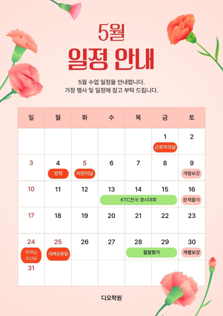 (광고) 안녕하세요. 5월 일정 미리 안내드립니다. 가정의 달인 만큼 휴일이 있지만 학원에 나오는 때에는 최선을 다해 수업할 수 있도록 준비하겠습니다. 5월 1일 (휴원) ---법정공휴일--- 근로자의 날 5월 4일 (방학으로 휴원) 5월 5일 (휴원) ---공휴일---어린이날 5월 25일 (휴원)---대체공휴일---부처님오신날 5월 13일 ~ 15일 : KTC전국경시대회 실시 5월 16일 : 경시대회 문제풀이 5월 28일 ~ 29일 : 학원 월말평가 5월 9일, 30일 : 개별 보강 <img src="https://blogthumb.pstatic.net/MjAyNjA0MjFfMjc3/MDAxNzc2NzY0NDQyMTY3.wy2qqlo8Zj4EZm5knXmLIFBOHka402r4HFMvHIf-Vfcg.MeO_jBO1VJlivDPNgqTMJAuLctyhjyx-seh08pj3TBcg.JPEG/900%A3%DF%BA%D0%C8%AB%BB%F6_%B9%E8%B0%E6_%C4%AB%B3%D7%C0%CC%BC%C7_%C0%CF%B7%AF%BD%BA%C6%AE_5%BF%F9_%C1%F8%B7%E1_%C0%CF%C1%A4_%BE%C8%B3%BB_%C0%FC%B4%DC%C1%F6.jpg?type=s3" />