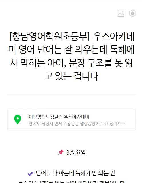 3줄 요약 ✔️ 단어를 다 아는데 독해가 안 되는 건 문장의 '구조'를 읽는 힘이 빠져있기 때문입니다 ✔️ 단어 뜻을 나열하는 해석과 문장을 이해하는 독해는 완전히 다른 능력입니다 ✔️ 향남영어학원초등부 우스아카데미는 단어 암기 전에 '문장 읽기 훈련'을 먼저 시작합니다 단어 시험은 매번 만점인데 독해 문제만 나오면 틀립니다. 이 상황, 혹시 겪고 계신가요? 아이가 단어를 못 외우는 건 아닙니다. 매일 20개씩 외우고, 시험도 잘 봅니다. 그런데 문장을 주면 뜻을 모릅니다. "이 단어 뜻이 뭐야?" 하면 바로 대답합니다. "이 문장이 무슨 뜻이야?" 하면 멈춥니다. 단어는 다 아는데 문....... <img src="https://phinf.pstatic.net/image.nmv/blog_2026_04_27_2766/OBmLR5RxYN_01.jpg?type=f480x480" />