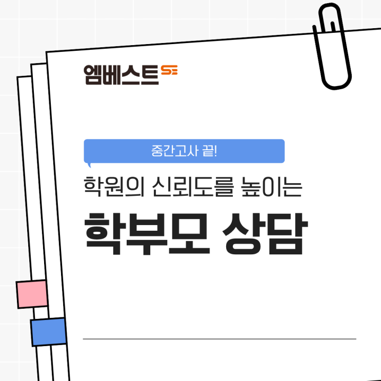 안녕하세요! 엠베스트SE 원장님. 새 학기 첫 중간고사가 마무리되고 있습니다. 시험 기간 동안 학생의 학습 지도와 학원 운영으로 많이 바쁘셨을 텐데요. 시험이 끝난 이후 가장 중요한 것이 바로 시험 결과에 대한 학부모 상담입니다. 성적이 기대에 미치지 못한 학생의 상담은 부담으로 느껴질 수 있지만, 학원의 전문성과 관리 역량을 보여줄 수 있는 중요한 기회가 될 수 있습니다. 오늘은 기말고사까지 학부모님의 신뢰를 이어갈 수 있는 중간고사 후 상담 핵심 포인트를 정리해 보겠습니다. 상담 전 필수 준비 1️⃣시험지 정밀 분석 학생의 점수 확인에 그치지 않고 오답의 유형과 원인을 구체적으로 파악합니다. ✅ 단순 실수....... <img src="https://blogthumb.pstatic.net/MjAyNjA0MjhfODQg/MDAxNzc3MzU0NTgxMzQx.RGtW8lJi2pp7lDu8ZkyFaj1DtvfVi7z8aBfXfqTUDhog.WZdjgoAM6-3ixCywtP2oYYc3E1zgN5Q88BqYSb-g8k8g.PNG/1.png?type=s3" />