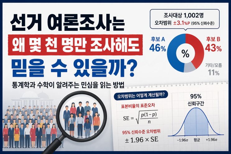 <<적은 표본으로 전체 민심을 읽는 통계학의 원리>> 선거 시즌이 되면 뉴스에서 자주 보게 되는 숫자가 있습니다. 후보 A 46% 후보 B 43% 오차범위 ±3.1% 조사 대상 1,002명 이 숫자를 보고 많은 사람들이 궁금해합니다. “국민은 수천만 명인데, 겨우 천 명 조사해서 어떻게 전체를 알 수 있을까?” 직관적으로는 전 국민을 다 조사해야 정확할 것 같지만, 실제 통계학은 일부만 잘 조사해도 전체를 상당히 정확하게 추정할 수 있다고 말합니다. 오늘은 그 이유를 수학적으로 살펴보겠습니다. 1. 핵심 개념: 모집단과 표본 통계에서는 전체 대상을 모집단(population) 이라고 하고, 그중 일부를 뽑아 조사한 집단을 표본(sampl....... <img src="https://blogthumb.pstatic.net/MjAyNjA0MjJfMTQ0/MDAxNzc2ODU4ODI1Nzg5.9R_OQGqfE5tNIqT90ZIazkIy8bLuZWdGyJPTuiTDuvUg.2jPjJ_vUd3K4ryuF6d25CJTdypp6Kr7EVtkSUsdh76Qg.PNG/%3F%97%AC%EB%A1%A0%EC%A1%B0%3F%82%AC_%3F%8D%B8%3F%84%A4%3F%9D%BC.png?type=s3" />