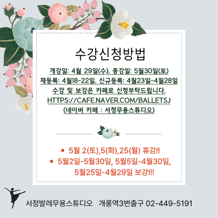 5월엔 공휴일이 많아 4월29일 미리 개강합니다!!! 꼭 기억하세요~~ 그리고 5월엔 특별이벤트 선물을 준비하고 있으니 기대해주세요^^ 저희학원은 아이들 수업에 안전한 차량운행 지원합니다♡ 서정발레 무용스튜디오 5호선 #개롱역 3번출구 앞 02-449-5191 #가락동발레 #취미발레 #성인발레 #발레 <img src="https://blogthumb.pstatic.net/MjAyNjA0MThfNDUg/MDAxNzc2NTE0MTU4Nzgy.2zudyJvP1LHHOg0owgYPU1DyPA5-HIpleIgI4JR1S18g.vAPRUUK68Sl3omHT0d1vemMXr1sw34FcVUsElvkrCOgg.PNG/900_1776512590788.png?type=s3" />