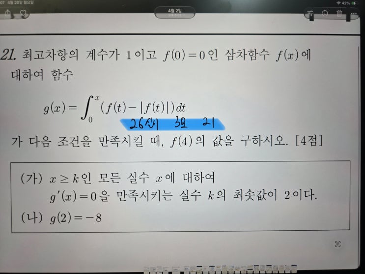 안녕하세요. 대치동에서 독학재수 & 수학학원을 운영 중인 리미트제로 수학학원입니다. [2026년 3월 모의고사 21번] 이번 3월 학력평가 21번 문항은 누가 봐도 ‘킬러’였습니다. 하지만 실제로는 난이도의 문제가 아니라 풀이 방식의 차이가 모든 것을 갈랐던 문제입니다. 포인트 1. 정석 풀이 = 시간 소모 문제 먼저 EBS 정석 풀이를 자세히 살펴보겠습니다. 결국 복잡한 적분 계산 인테그럴 식 정리 계산 밀어붙이기 ... 이 모든 과정을 거쳐 시간을 오래 잡아먹는 구조입니다. 실전 시험장에서 이 방식으로 접근한다면 인테그럴을 꼭 넣어야 함에 더불어 21번 하나에 과도한 시간을 써 뒤 문제에까지 치명적인 영향을 끼칠 수....... <img src="https://blogthumb.pstatic.net/MjAyNjA0MjBfNDcg/MDAxNzc2Njc4NzU2ODcx.W3zAcBBNwrT9GeukxHHUM7NiD2MCcfIaaqyrDQaAvdog.Ci29y9P4FoS9A8hXUCBeWVRpf3YR-TtvJohn5LdZzGsg.JPEG/1._26_3%B8%F0_21_%B9%AE%C7%D7%BB%E7%C1%F8.jpg?type=s3" />