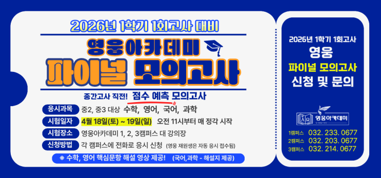 [시험 D-14] 영웅 파이널 고사로 완벽 마무리! ━━━━━━━━━━━━━━━━━━━ 26년도 첫 시험, 제대로 준비하고 있나요? ━━━━━━━━━━━━━━━━━━━ 안녕하세요~ 영웅 지킴이입니다! 시험이 이제 약 2주 남았습니다. 지금 이 시점에서 가장 중요한 건 바로 “내가 얼마나 준비되어 있는지 정확히 아는 것”입니다. ▶ 실전 점검의 핵심, “영웅 파이널 고사” 영웅아카데미에서는 매년 시험 전 미리 보는 실전 시험, “영웅 파이널고사”를 진행합니다! ✔ 재원생 & 비재원생 모두 응시 가능 ✔ 재원생은 수강 과목 필수 응시 단순한 테스트가 아닙니다. 남은 2주를 바꾸는 중요한 시험입니다. 왜 꼭 봐야 할까....... <img src="https://blogthumb.pstatic.net/MjAyNjA0MTRfMTQx/MDAxNzc2MTc4NjM1ODUz.9BUDcFZqnlhCzl6_C_UWyS4RAt1dp9iKMuZhFUd8oNcg.GlrLpmVrKh--AX3ughlm9duQVcDk4JjVNCAnERUWSpgg.PNG/KakaoTalk_20260414_121926237.png?type=s3" />