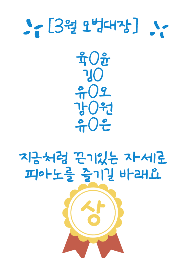 안녕하세요^^ 삼산동 음악학원 더이화음악학원입니다. 새학기 새로운 환경속에 설레고 긴장되는 시간들을 보내며~ 잘 적응해준 우리 친구들 너무나 대견합니다. 더이화음악학원은 끈기있는 힘과, 집중하는 습관을 기를 수 있도록 매월 "모범대장상"의 주인공을 선발합니다~~~✨ 성실하게 참여한 친구들에게 칭찬과 격려의 의미로 상을 수여한다고 안내를 했었는데요, 우리 친구들,, 더-욱 열심히 연습하고 초롱 초롱한 눈빛으로 모범대장 언제 발표하냐고 물어보는데~ 너무 귀여웠네요 ㅎㅎ 이런 보상이 아이들을 집중하게하는 동기부여가 되는 듯 합니다. 모범대장 선물은? 상장과 칭찬도장 50포인트 랍니다. 두....... <img src="https://blogthumb.pstatic.net/MjAyNjA0MTRfODkg/MDAxNzc2MTc4Njk0MTQz.W8WltnFQhAJz0oJNmC1zDO7cQ9NLalhnEOvjFxV3QREg.8X4FZq0YM8vwRVsdCvRKv8uW6PtXhZSJZFTWzNBPe-gg.PNG/IMG%A3%DF4208.PNG?type=s3" />