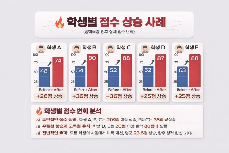 방학특강, 결과로 증명했습니다 이번 방학특강 이후 학생들의 점수 변화를 보면 ‘열심히 했다’가 아니라 ‘확실히 올랐다’는 말이 더 정확합니다. 실제 데이터에서 확인된 변화입니다. 단순 문제풀이가 아닌 구조 독해 훈련 효과 특히 눈에 띄는 점은 대부분 학생들이 ‘동시에’ 상승했다는 것 특정 학생만 오른 게 아니라 전체 평균이 올라갔다는 것 ⸻ 왜 결과가 나왔을까요? 저희 수업은 다릅니다. • 고1 모의고사 수준 기반 실전 훈련 • 독해 구조 이해 중심 후 유형별 독해 접근 • Listening은 ‘많이 듣기’가 아닌 정확히 듣는 훈련 • 방학 동안 반복 + 피드백으로 완전 체화 ⸻ 이런 학생에게 특히 효....... <img src="https://blogthumb.pstatic.net/MjAyNjA0MTZfMTcz/MDAxNzc2MzA1OTAxOTE1.igOkVxqNS8KTa47gDonNxTLIG9U21-09k7eqDEhbU6Ag.tCe3fnm8yoq1CH1nootYVhXMrePO2cC_-60jge87oDcg.JPEG/D02EDFC5%A3%ADB33D%A3%AD4157%A3%AD83F3%A3%AD9B926D886342.jpg?type=s3" />