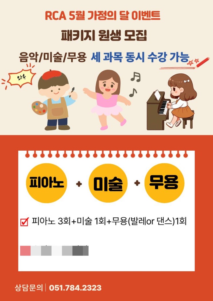 패키지 이벤트 가정의 달 5월을 맞이 하여 RCA음악무용미술학원에서 다양한 과목을 이벤트가로 수업해 볼수 있는 기회를 드립니다. 피아노도 배우고 싶고~ 미술도 배우고 싶고~ 댄스/발레도 배우고 싶은~ 친구들 모두모두 모여랏~~~~~! 자세한 문의는 원으로 연락 부탁 드립니다^^ <img src="https://blogthumb.pstatic.net/MjAyNjA0MjBfMjkg/MDAxNzc2NjY1MjI0Nzk1.TVg9yj-XMHJ0ohWra6EucagsaBRYOOw58TYLkZZ8SBIg.MGpL7K_LE3M1ExXIqppo167dwcDzwJkxnfiUku6lkoEg.JPEG/%C6%E4%C5%B0%C1%F6.jpg?type=s3" />